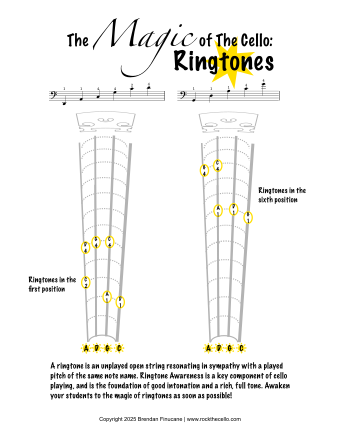 A ringtone is an unplayed open string resonating in sympathy with a played pitch of the same note name. Ringtone Awareness is a key component of cello playing, and is the foundation of good intonation and a rich, full tone. Watch eyes light up as the strings vibrate as if by magic. Awaken your students to the magic of ringtones as soon as possible!